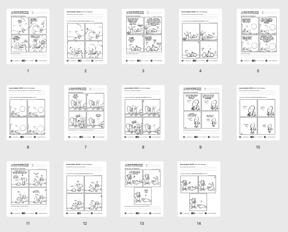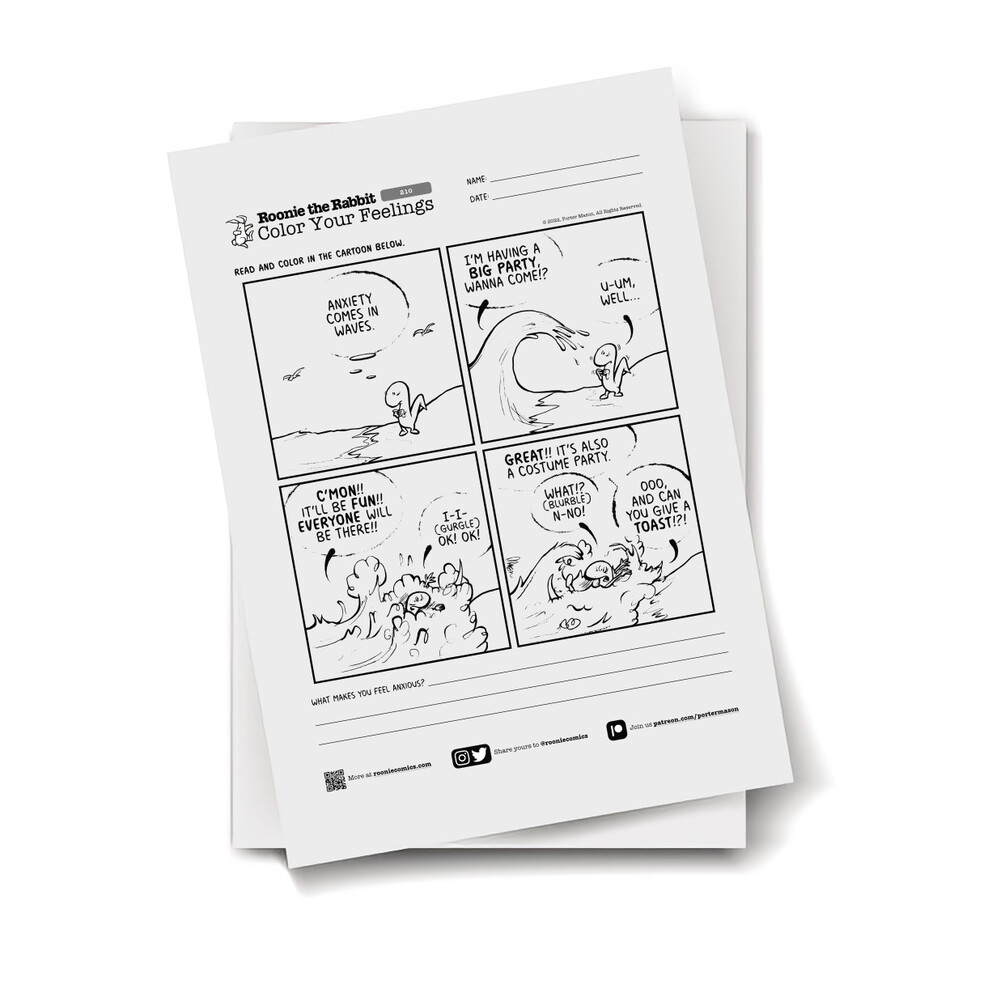 This PDF includes coloring page versions of the comics, along with writing prompts written by a certified Child Life Specialist to help kids communicate better about difficult emotions.