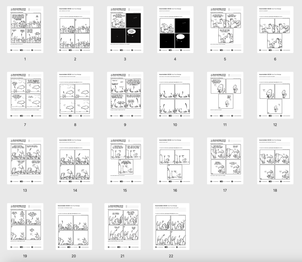 This PDF includes coloring page versions of the comics, along with writing prompts written by a certified Child Life Specialist to help kids communicate better about difficult emotions.